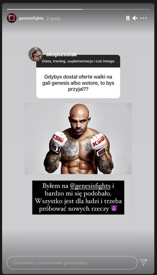 Na Instastory Akopa Szostaka pojawił się wpis w którym ten znany trener personalny odniósł się do pytania, czy przyjąłby ofertę walki na gali Genesis lub Wotore.