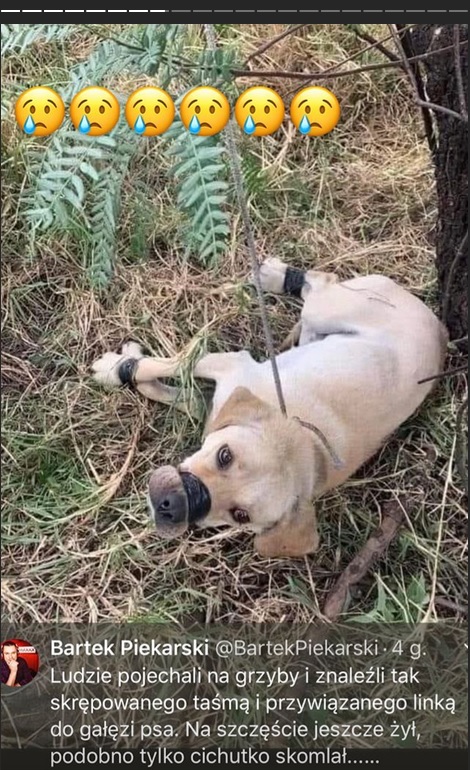 I w tym momencie pokazuje zdjęcie skrępowanego psa, którego ktoś znalazł w lesie: