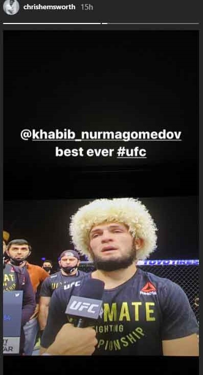 Chris Hemsworth aktor znany z roli „Thora” oddał hołd mistrzowi świata MMA w wadze lekkiej Khabibowi Nurmagomedovowi, który ogłosił, że wycofuje się z tego sportu po tym, jak ujawnił, że „obiecał matce”, że jego starcie z Justinem Gaethje na UFC 254 będzie jego ostatnią walką.