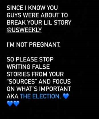 Żona Justina Biebera w relacji na Instagramie zaprzeczyła, że jest w ciąży, oznaczając profil magazynu Us Weekly i wzywając ich do skupienia się na tym, „co jest ważne, czyli wybory prezydenckie”.