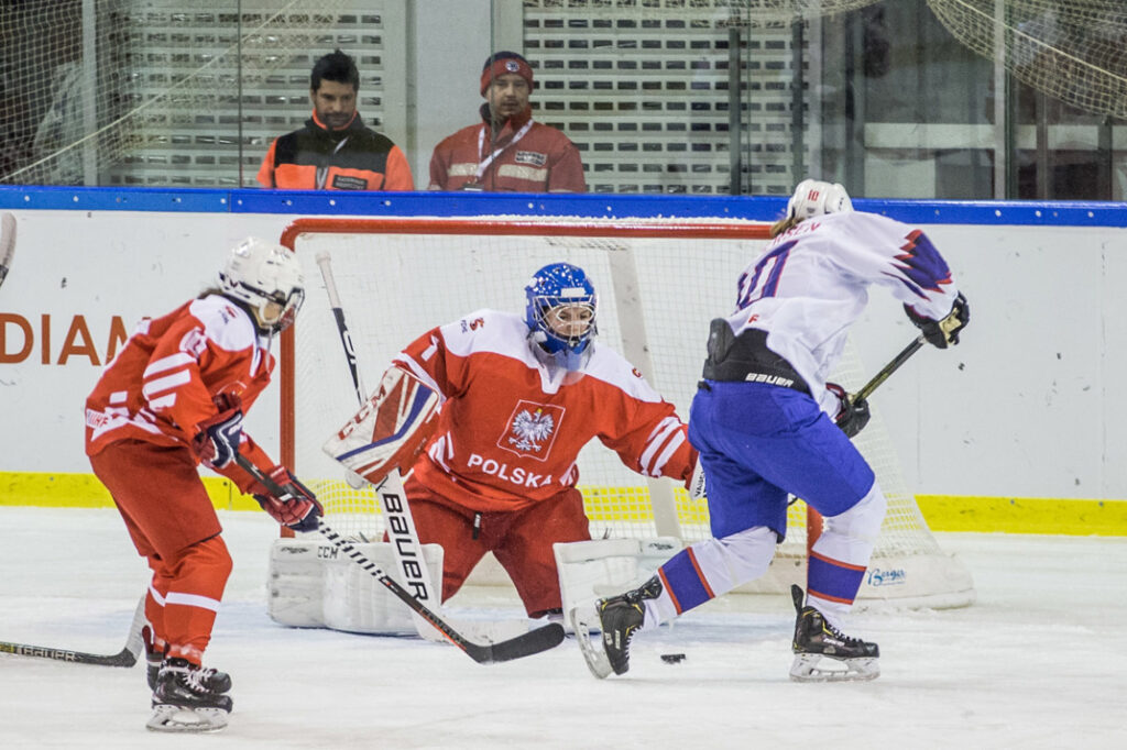 Druga tercja przyniosła mnóstwo emocji, walki na lodzie, ale też – niestety – sporo karnych minut naszych zawodniczek. Efektem była konieczność bronienia się w osłabieniu, także 3 na 5. Skończyło się na golu dla rywalek. W trzeciej tercji najpierw koncert gry dała Helena Grzybowska, potem pokaz świetnego dopingu zaprezentowali polscy kibice. Nasze zawodniczki ruszyły do przodu, świetne okazje bramkowe miała Wiktoria Sikorska, w końcówce graliśmy z pustą bramką, jednak wynik się nie zmienił.