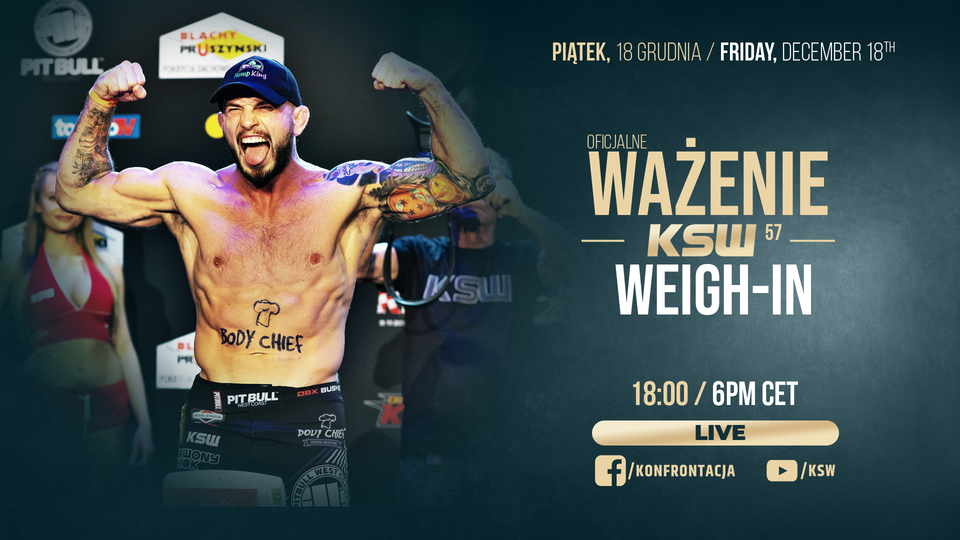 Oficjalną ceremonię ważenia i face to face fani będą mogli obejrzeć na żywo na Facebooku i kanale YouTube organizacji KSW dziś o godzinie 18:00.
